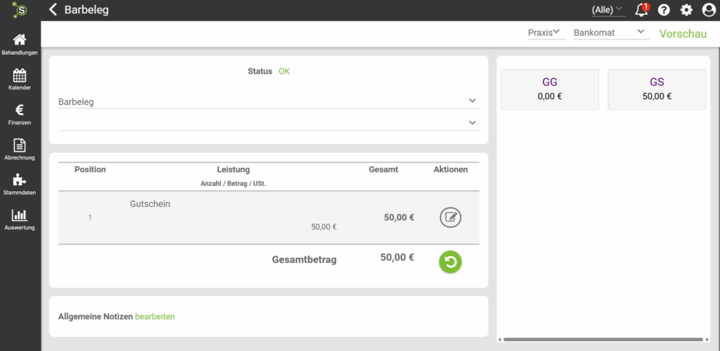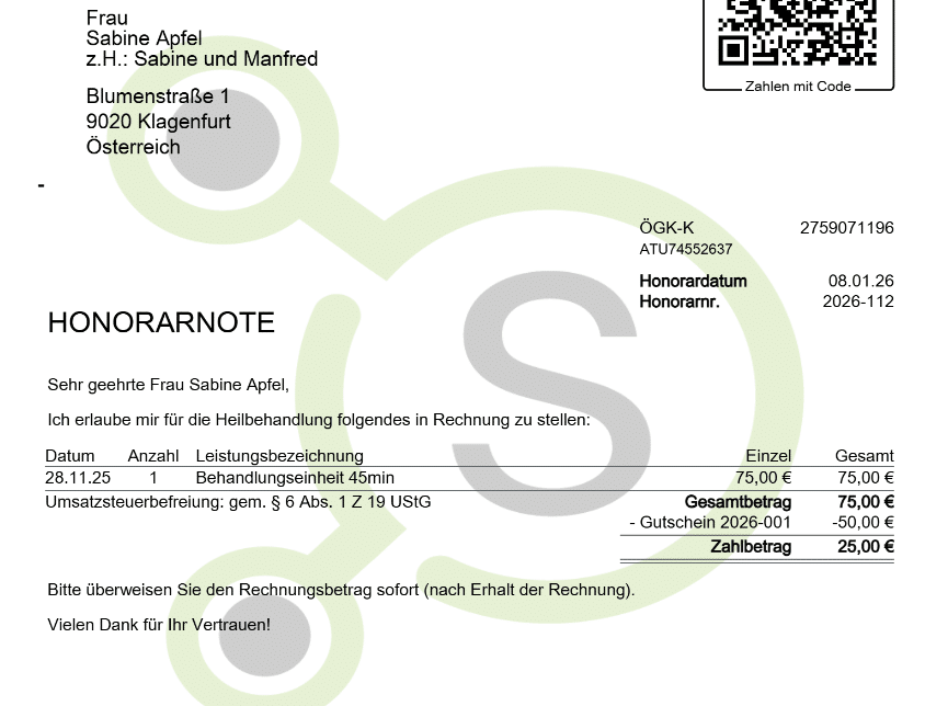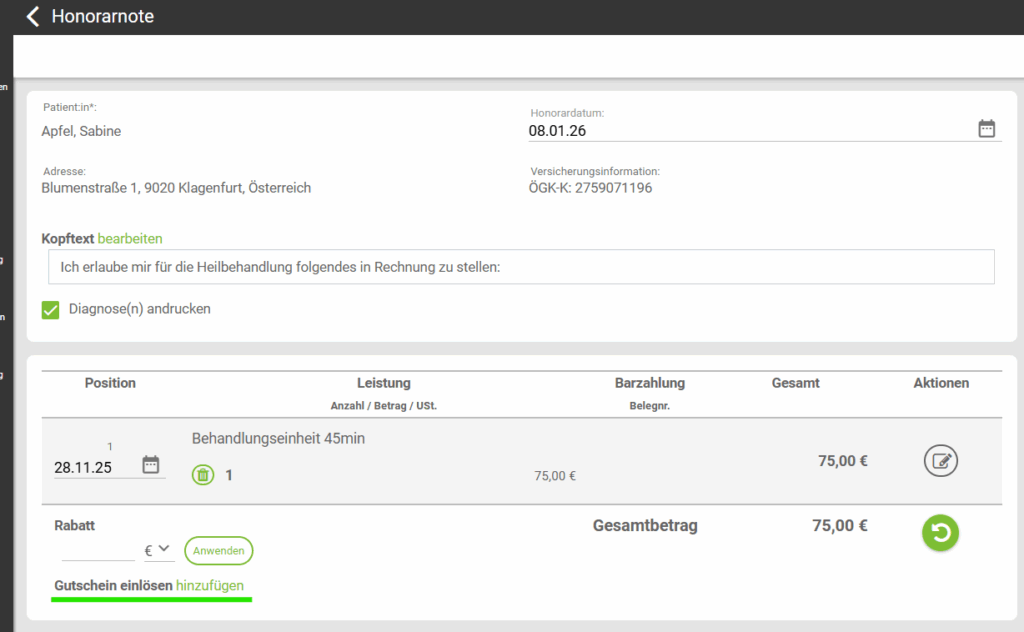 Ein Gutschein kann nur auf einer Honorarnote mit der Zahlungsart „Überweisung“ angewandt werden! Auf einem Barbeleg wird dir kein Gutschein vorgeschlagen.