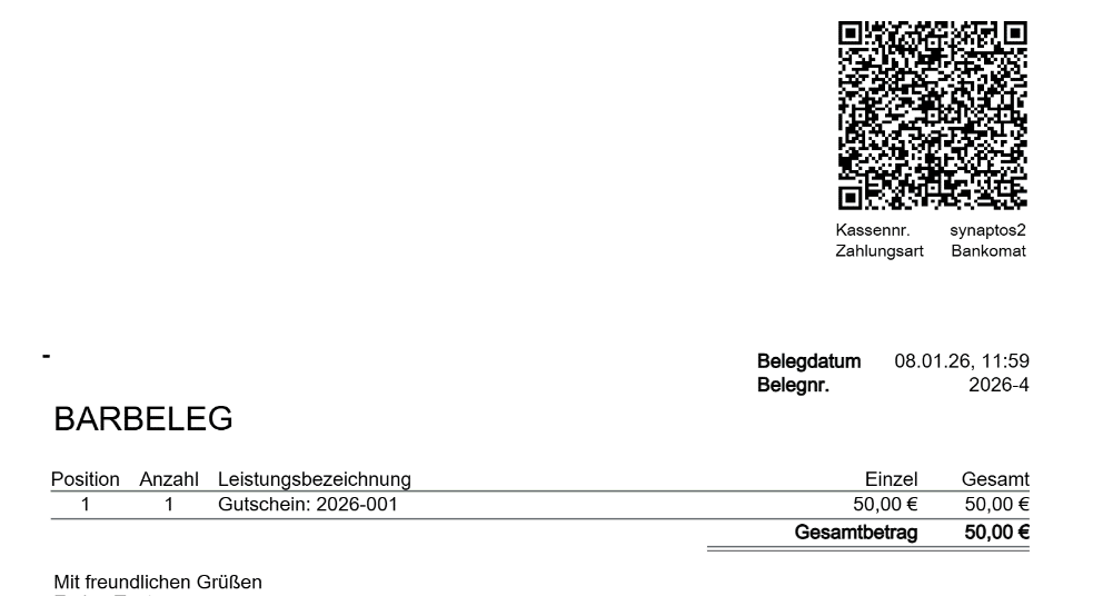 Auf dem nun erstellten Beleg findest du die Gutschein-Nummer des eben verkauften Gutscheins.