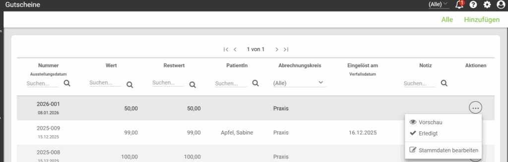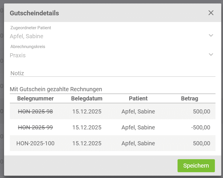 Außerdem kannst du den Abrechnungskreis des Gutscheins nachträglich ändern, eine Notiz hinzufügen und einsehen, bei welcher Honorarnote der Gutschein eingelöst wurde.