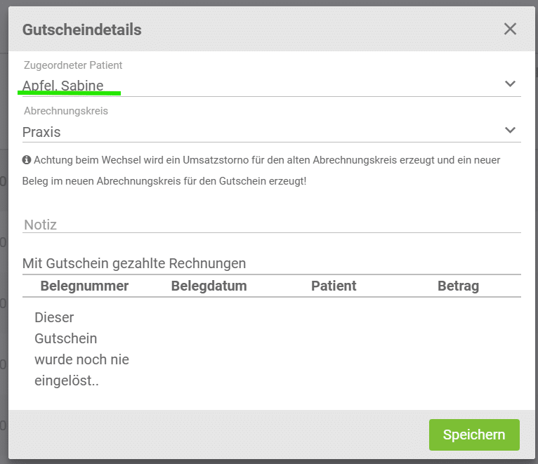 Wenn du die Stammdaten bearbeitest, kannst du einen Patienten zuordnen. Das ist wichtig, um bei diesem Patienten den Gutschein in der Abrechnung vorgeschlagen zu bekommen!