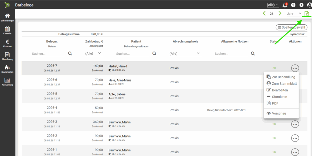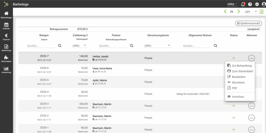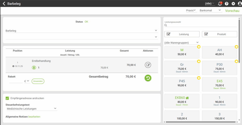 Wechsle in die Behandlung des Patienten, um durchgeführte Termine mittels Barbeleg abzurechnen.