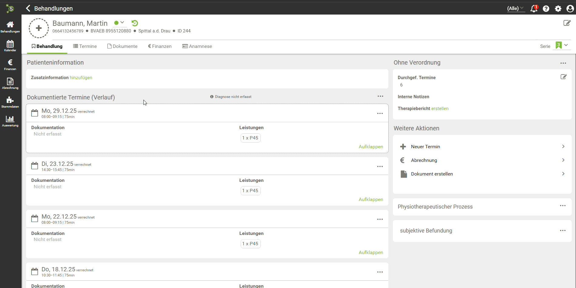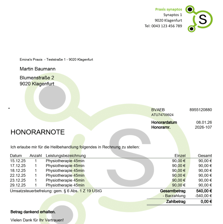 Am Ende der Serie hast du optimalerweise alle Leistungen bereits durch Barbelege abgerechnet und musst nur noch eine Honorarnote für deine Patient:inen erstellen.