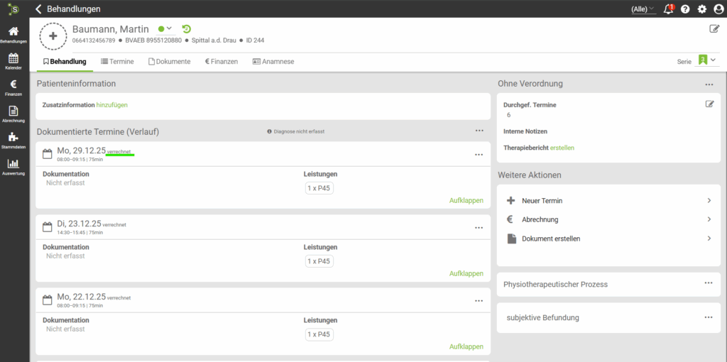 Wenn du jede Behandlung direkt bar verrechnen möchtest, musst du für jede einzelne Behandlung über weitere Aktionen >Abrechnung > Barbeleg einen Barbeleg erstellen.