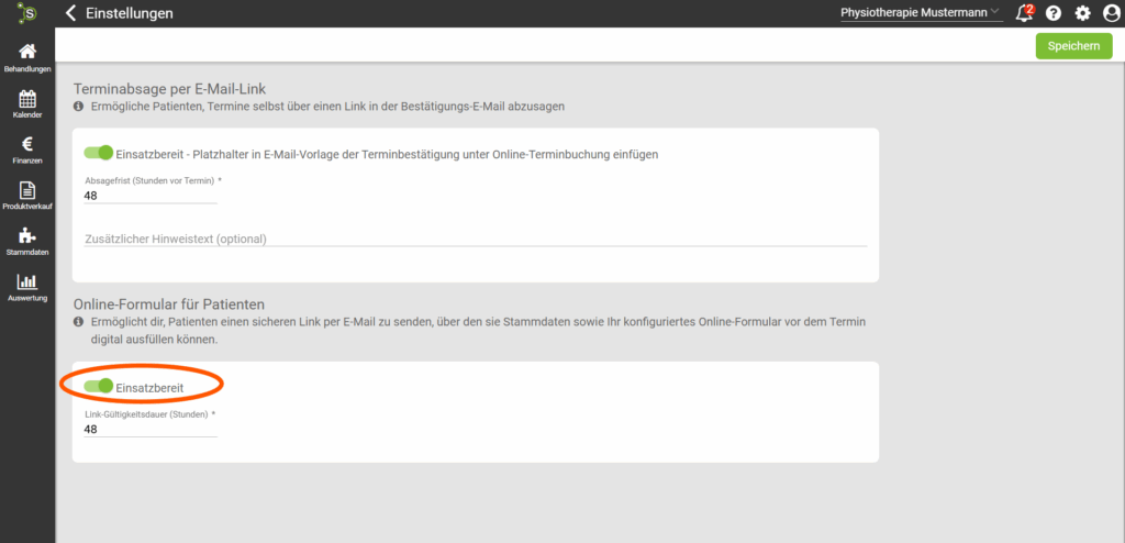 Nachdem Du den Anamnesebogen eingestellt hast, kannst Du die Funktion der Online-Formulare aktivieren.