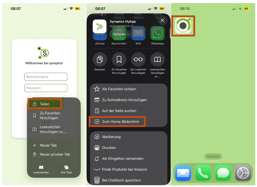 Bevor du synaptos am Homebildschirm hinterlegen kannst, musst du dich zuerst in Safari anmelden. Rufe dafür in Safari app.synaptos.at auf.